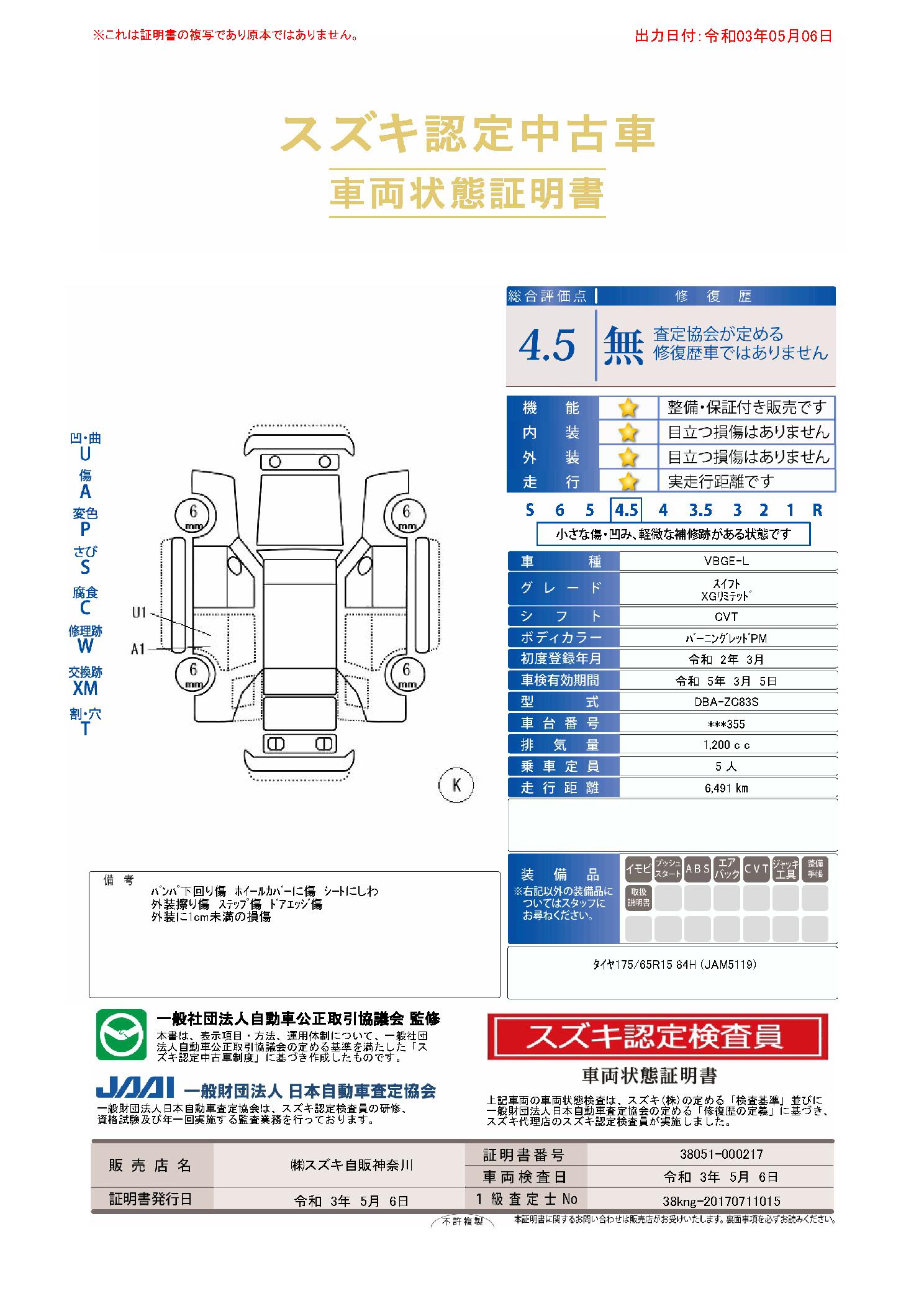 スズキ スイフト 1 2 Xgリミテッド メーカー認定車両品質評価書